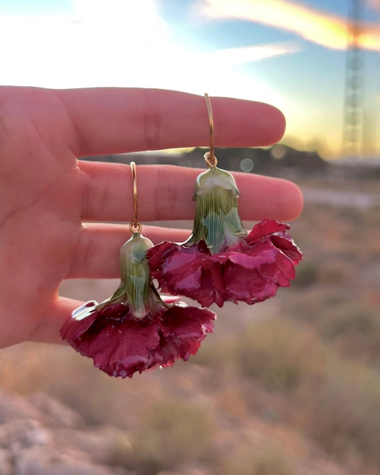 El clavel es un símbolo de elegancia y amor propio, preservada en resina cristalina. Ligeros, delicados y únicos.